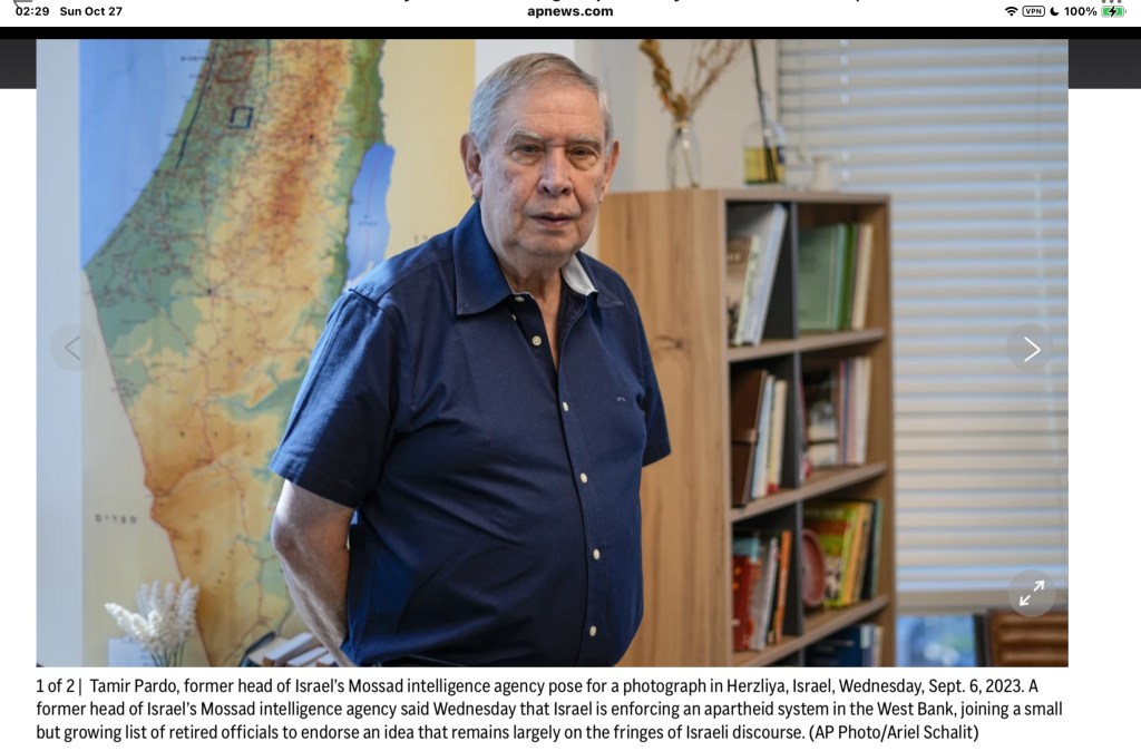 HERZLIYA, Israel (AP) — A former head of Israel’s Mossad intelligence agency told The Associated Press on Wednesday that Israel is enforcing an apartheid system in the West Bank, joining a tiny but growing list of retired officials to endorse an idea that remains largely on the fringes of Israeli discourse and international diplomacy.