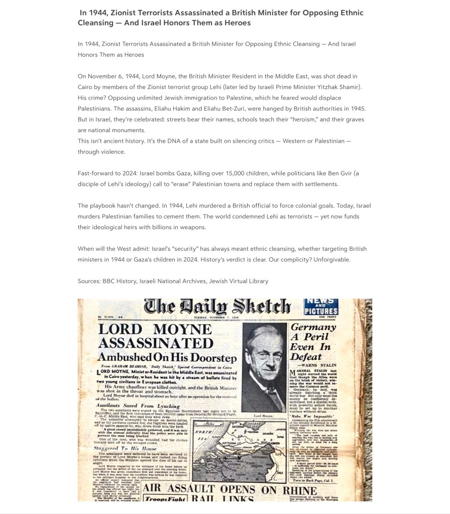 Image In 1944, Zionist Terrorists Assassinated a British Minister for Opposing Ethnic Cleansing — And Israel Honors Them as Heroes March 20, 2025The Cayman Institute Share this: Click to share on WhatsApp (Opens in new window) WhatsApp Click to print (Opens in new window) Print More Click to share on LinkedIn (Opens in new window) LinkedIn Click to share on X (Opens in new window) X Like Loading...