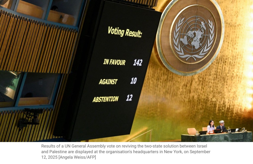 Image UN General Assembly backs two-state push for Israel and Palestine September 12, 2025The Cayman Institute https://aje.io/zsx2zw Share this: Click to share on WhatsApp (Opens in new window) WhatsApp Click to print (Opens in new window) Print More Click to share on LinkedIn (Opens in new window) LinkedIn Click to share on X (Opens in new window) X Like Loading...
